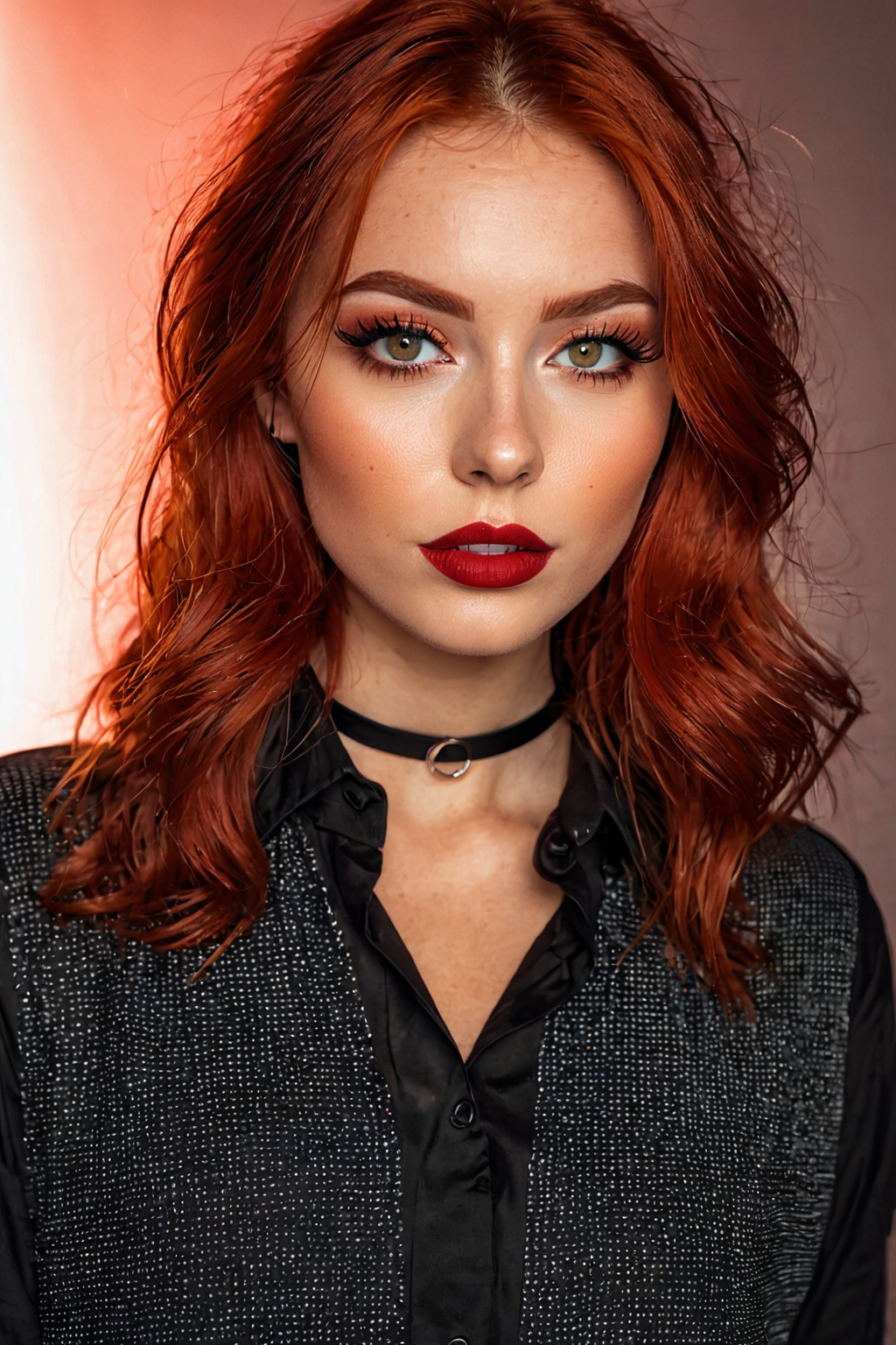raw photo, (25yo redhead girl:1.2), makeup, graphic eyeliner, rouge, (choker:0.9), realistic skin texture, oversize shirt, (red:0.8), softcore, warm lighting, cosy atmosphere, instagram style