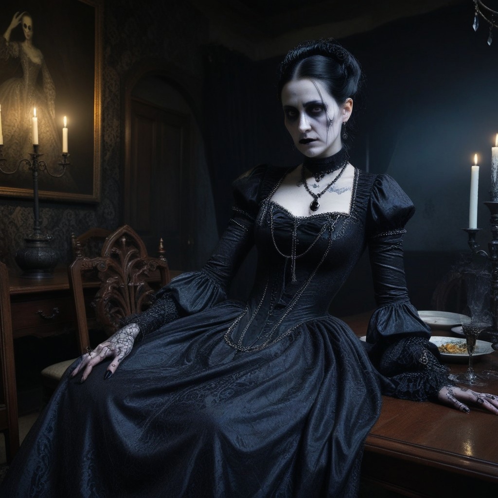Masterpiece, High Details, High Quality, HD, woman, antique gothic dress, sleeves, jewelry, sitting in the dining room, dark room, mysterious, spooky