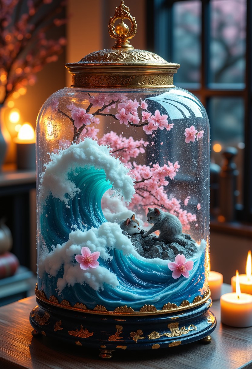 surreal, hyper-detailed, aidmamj6.1, A surreal and intricately designed glass terrarium containing a self-contained sakura blossoms tempest, where a legendary cat battles against towering waves frozen in time. The blossoms are masterful interplay of cerulean pink and foamy whites, captured in exquisite motion as it collides with jagged rocks emerging from the depths. The ornate golden lid of the terrarium glistens under the dim candlelight of a mystical setting, as condensation trickles down its pristine surface, blurring the line between reality and illusion. The entire composition radiates a timeless elegance, evoking a sense of adventure and artistry in a single suspended moment. <lora:aidmaMJ6.1-FLUX-v0.5:0.7000000000000001> <lora:FluxDFaeTasticDetails:0.3>