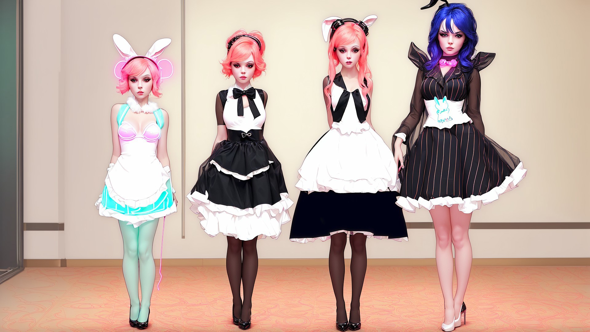 tiny neon glass filaments, casino, girls in bunny suits.