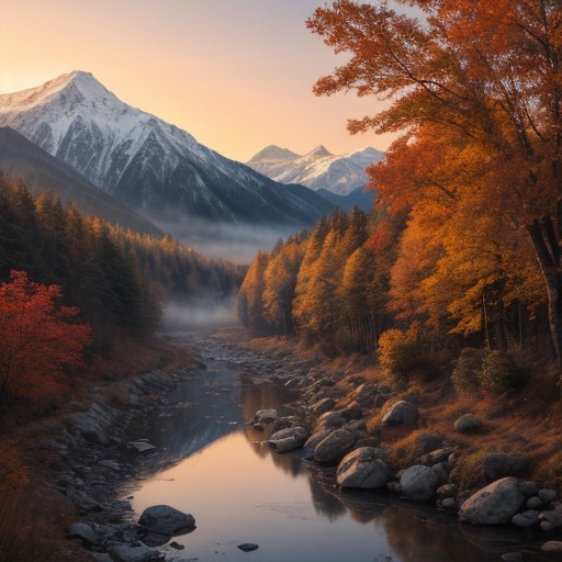 landscape river, autumn forest, mountains, sunrise, morning haze, depth of composition, pronounced volume of composition, detailed background, detailed textures, main object of composition in focus, distributed composition,