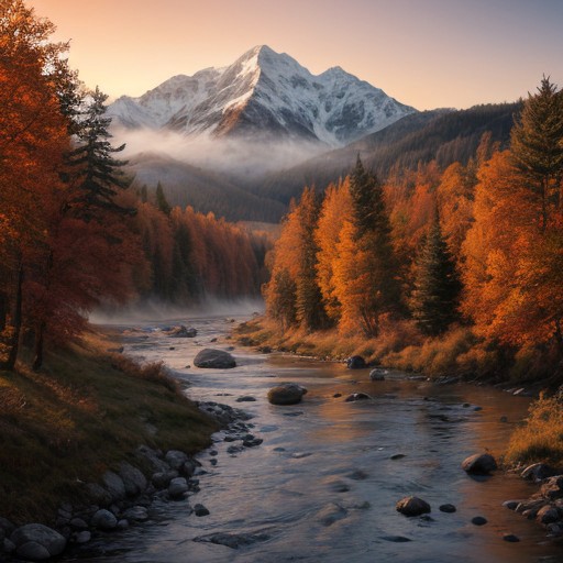 landscape river, autumn forest, mountains, sunrise, morning haze, depth of composition, pronounced volume of composition, detailed background, detailed textures, main object of composition in focus, distributed composition,