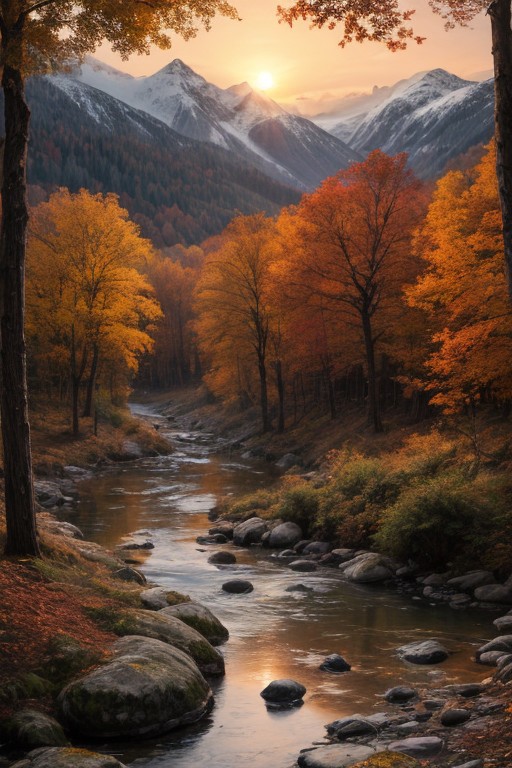 landscape river, autumn forest, mountains, sunrise, morning haze, depth of composition, pronounced volume of composition, detailed background, detailed textures, main object of composition in focus, distributed composition,