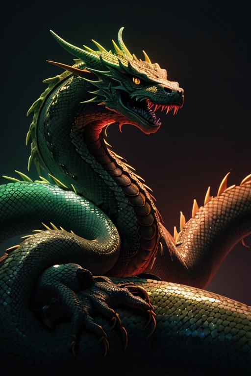 Asian dragon , green, red, gold snake gradient vibrant neon colour, rough, textural, broad brush strokes, red color prominent detailed, alienzkin, silhouette, spotlight, dark theme, c4d, blender, raytracing, unreal engine 5, render 3d