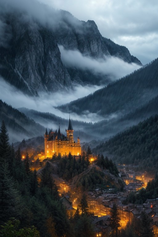 landscape, magic castle- city in mountains, rainy day, at night, cloudy, misty,