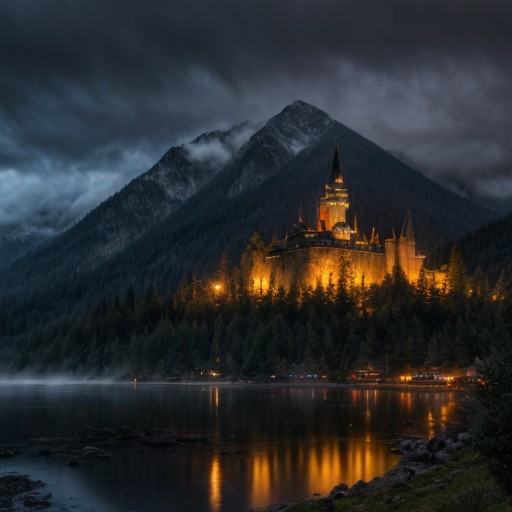 landscape, magic castle- city in mountains, rainy day, at night, cloudy, misty,
