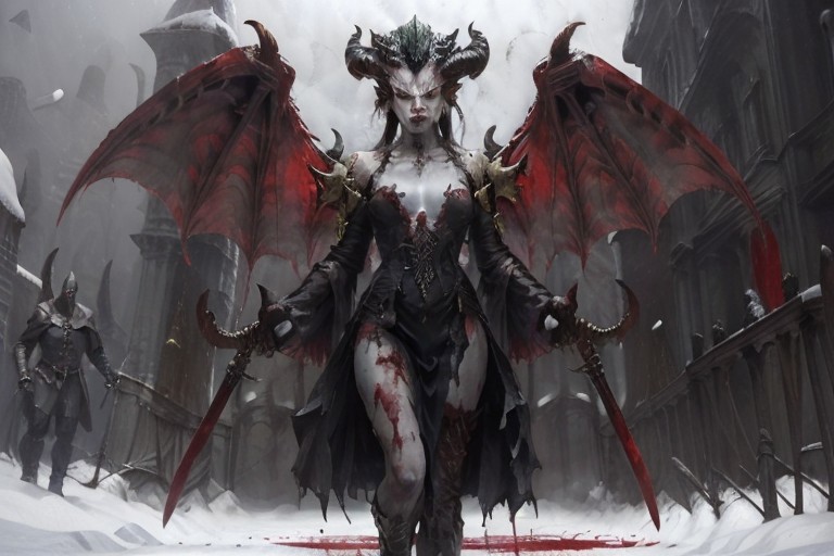 in anger I rise, let my tears dry as my swords drink your blood! 1woman, barefoot in the snow, snarl, slender swords, torn black dress, bloody footprints, dynamic, looking at viewer, sharp fangs, green eyes, golden pupils, blood in the snow, lilith