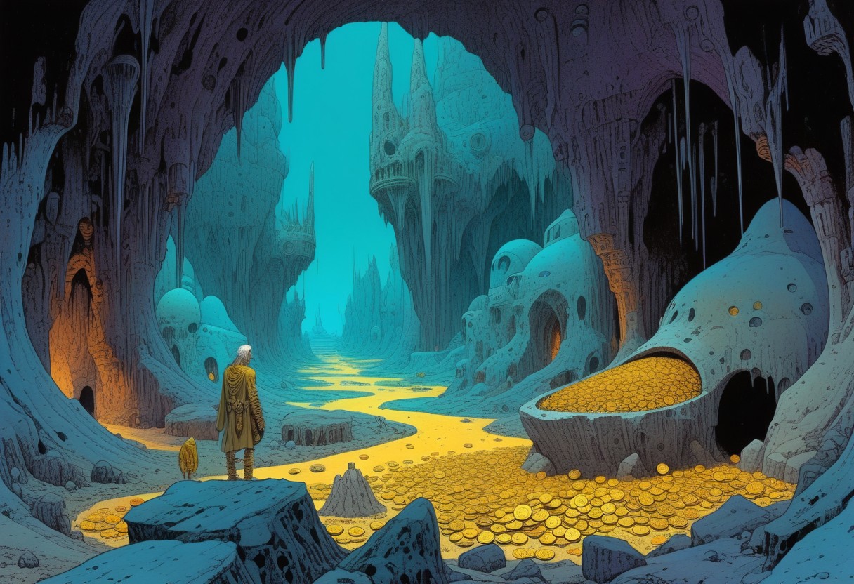 Landscape, Moebius (Jean Giraud) Style page, caverns, treasure horde, dark, luminescent, relics, fantasy, golden coins, treasure