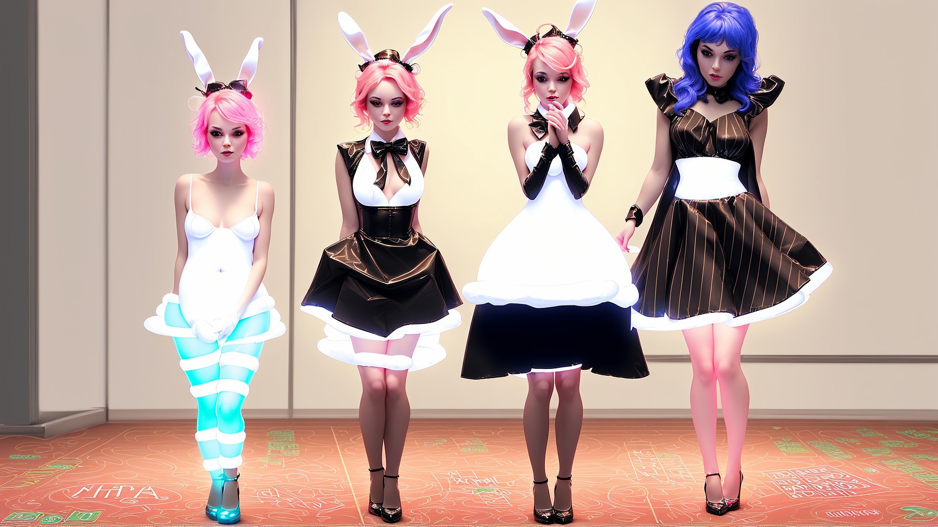 tiny neon glass filaments, casino, girls in bunny suits.