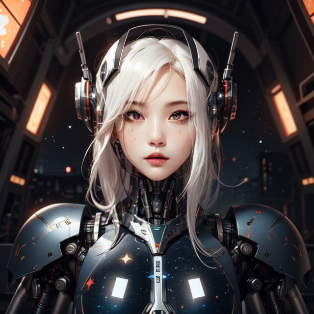 masterpiece,best quality,ultra-detailed,very detailed illustrations,extremely detailed,intricate details,highres,super complex details,extremely detailed 8k cg wallpaper,cowboy shot,caustics,reflection,ray tracing,demontheme,nebula,dark aura,cyber effect,(1girl:1.4),solo,alone,mecha musume,mechanical parts,robot joints,single mechanical arm,headgear,mechanical halo,star halo,intricate mechanical bodysuit,mecha corset,full armor,very long hair,white hair,hair between eyes,multicolored hair,colored inner hair,red eyes,glowing eye,eye trail,random expressions,random action,ancient japanese architecture,pond,starry sky,skyline, ,<lora:AMechaSSS[color_theme,mecha musume, mechanical parts,robot joints,headgear]>
