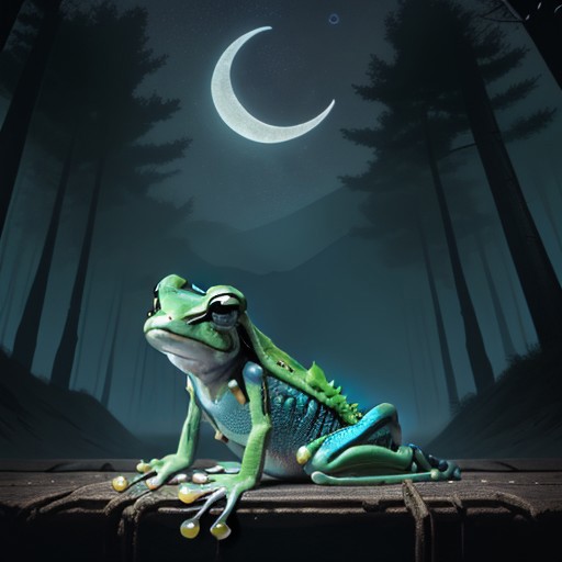 ((masterpiece,best quality)), absurdres, <lora:CiTron_Legacy:0.8>, citron legacy, (metallic frog:1.2), electricity, blue glow, blue theme, moon, starry sky, forest, futuristic forest,