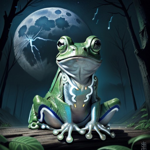 ((masterpiece,best quality)), absurdres, <lora:CiTron_Legacy:0.8>, citron legacy, (metallic frog:1.2), electricity, blue glow, blue theme, moon, starry sky, forest, futuristic forest,