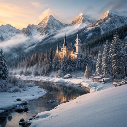 landscape, magic castle- city in mountains, snow, snowing, morning haze, winter,