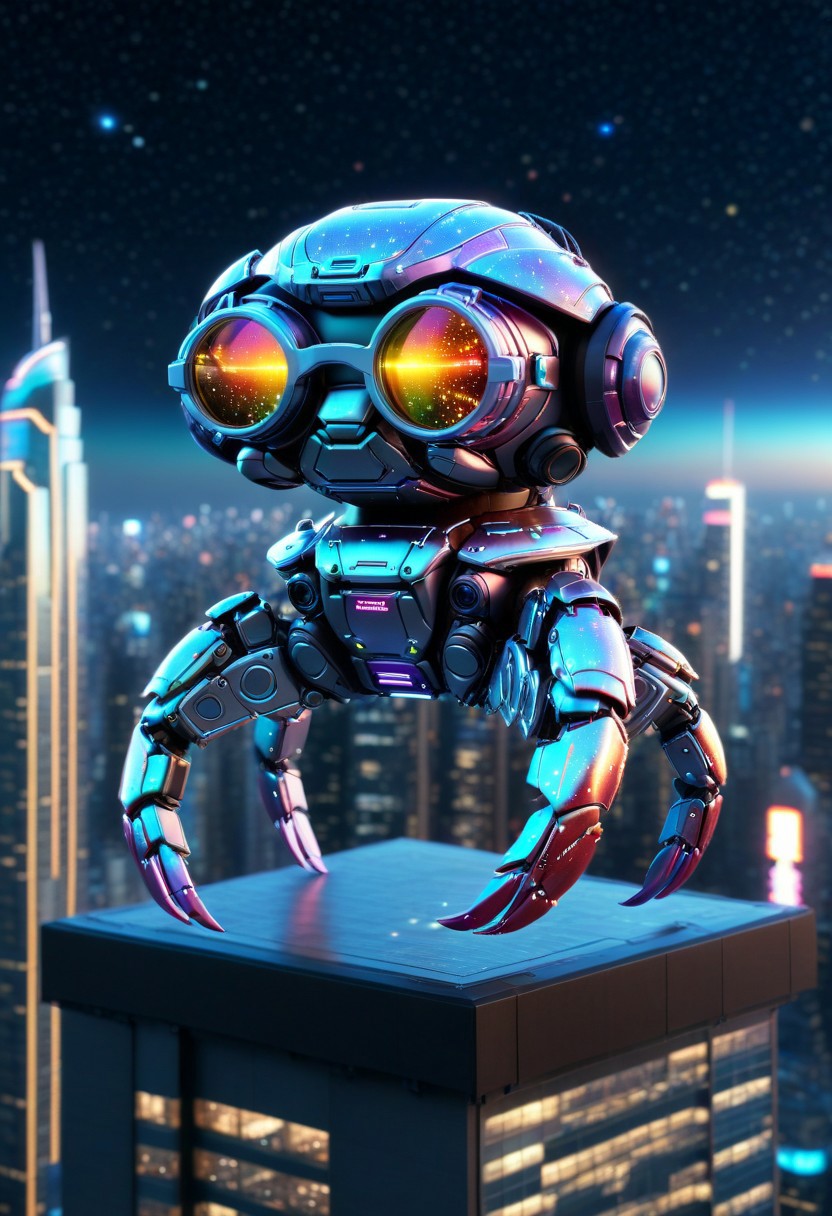 (Holography:1.3), h4v_h0l0 cute small mecha crab, wear round goggles, from side, on the top of a skyscraper, night city, Starry sky, cinematic, cinematic lighting, (masterpiece, best quality:1.4), ultra-high res, 4k, insanely detailed, sfw,