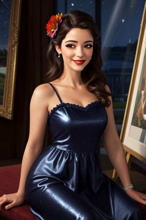 (ultra realistic,32k, masterpiece:1.2),(high detailed skin:1.1),( high quality:1.1), <lora:PrincessHildegard:0.5>(depressed:1.1), (long lashes, mascara:1.1), eyeliner,princess hildegard, brown eyes, hair flower, 1girl, solo,raspberry night gown dress,glitter sparkling dress, sleeveless, night, starry night, moonlight,,(looking at viewer, sitting:1.1),, (large breasts, medium breasts:0.7),<lora:add_detail:1>, (dense light rays:1.1),sexy pose, short minidress, seducative smile, neoclassical painting,