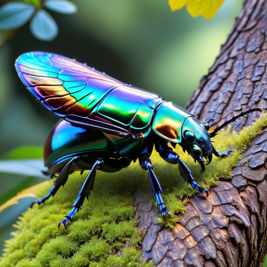 8k, score_9, score_8_up, score_7_up,(h4v_h0l0:1.5), masterpiece,realistic,ultra detailed, vibrant colors,photo-realistic, rhinoceros beetle, iridescent wings, perched on a tree