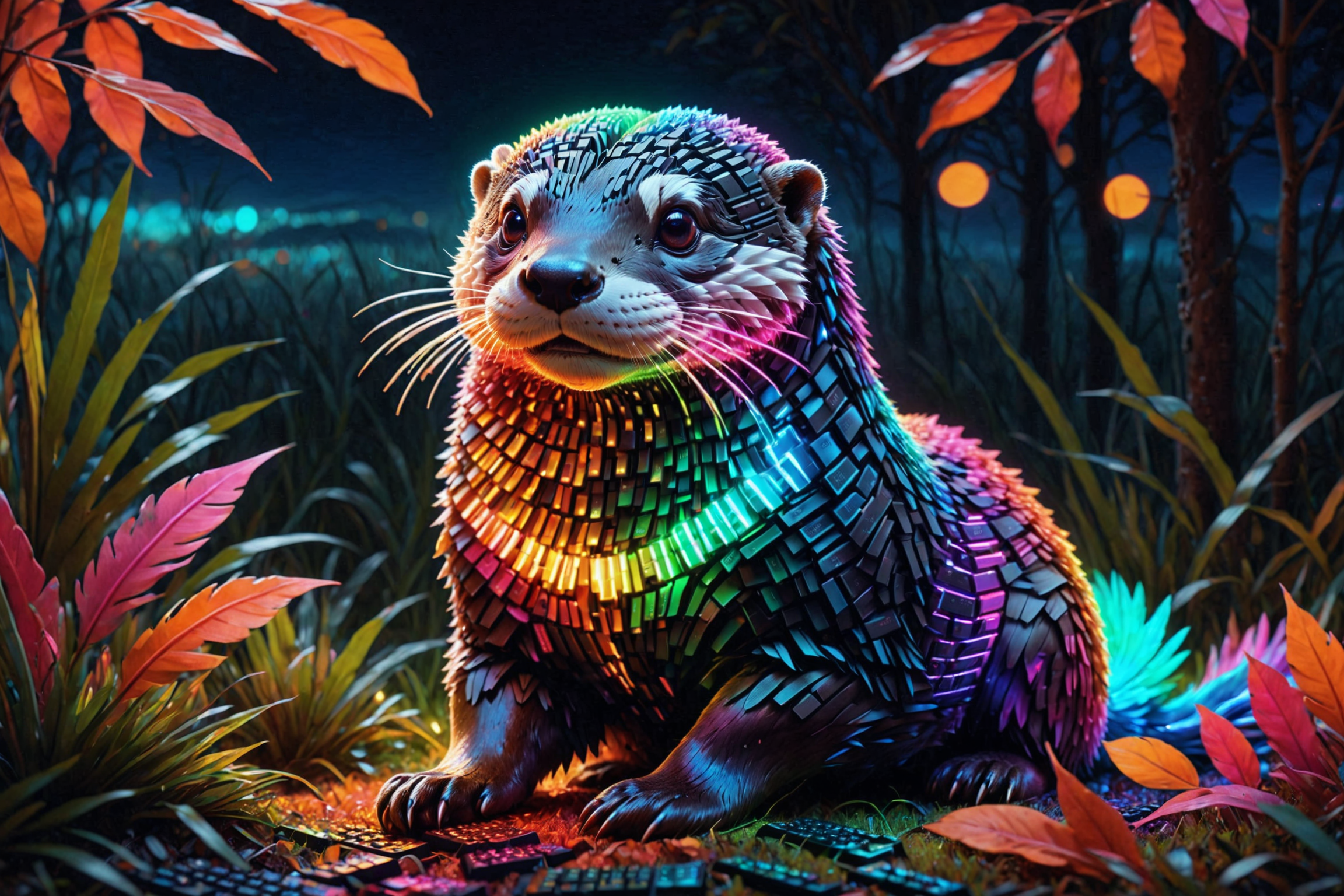 sexy a cute otter made out of RGB Keyboards, with sleek fur, playful expression, solo, with neon red RGB lights, intense and fiery, pulsing with a digital shine from RGB lights, vibrant and dynamic, a neon autumn field with glowing orange leaves, RGB breeze, and a vibrant sunset, detailed background, hiding in an RGB forest, eyes peeking, happy, ears perked, action focus, medium shot, an electric cuddle party with animals snuggling, neon blankets, and a glowing burrow, a digital feather, shimmering with RGB colors, tucked in its fur, on neon-lit ground, glowing with RGB reflections, digital fog with RGB lights in the mist, glowing particles, dawn, soft pink and orange hues, early light, fresh air, best quality, vibrant colors, realistic style, high detail, high-definition, hyper-realistic, extremely high-resolution details, fine texture, incredibly lifelike, realistic, not cartoon, not drawing, highres, 4K resolution, source photo, realistic photo, masterpiece, best quality, amazing quality, very aesthetic, ultra-detailed, detailed textures, natural lighting, soft light, digital rainbow colors, full spectrum glow, digital flash, bright and intense, medium shot, <lora:RGB_Keyboard_themed-000008:1>