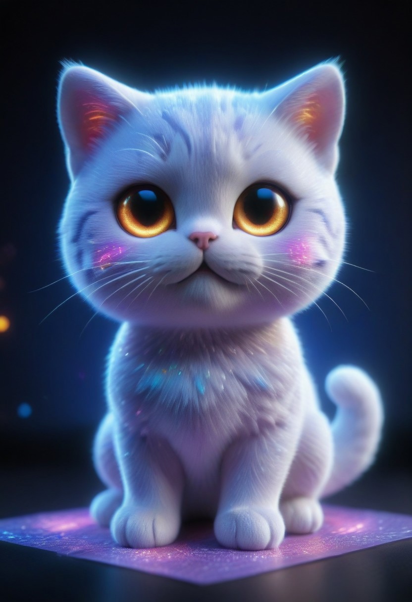 holographic, h4v_h0l0, cat, cute, chibi, glowing eyes, made of holographic, High Quality, Soft Texture, Full Colour, made of ral-smlvltnpls, masterpiece, dynamic, awesome quality,soft lighting,artistic composition, high contrast, high resolution, visual aesthetics, masterpiece, sfw