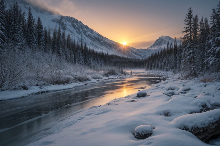 landscape river, winter forest, snow, snowing, winter, mountains, sunrise, morning haze, depth of composition, pronounced volume of composition, detailed background, detailed textures, main object of composition in focus, distributed composition,