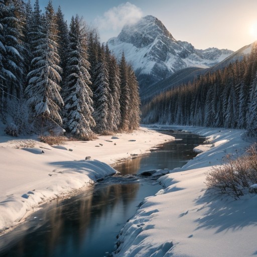 landscape river, winter forest, snow, snowing, winter, mountains, sunrise, morning haze, depth of composition, pronounced volume of composition, detailed background, detailed textures, main object of composition in focus, distributed composition,
