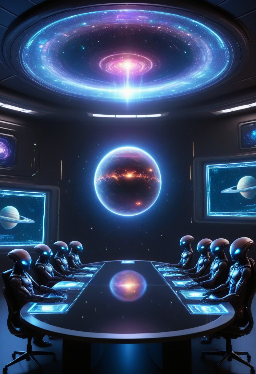 score_9, score_8_up, score_7_up, transparent glowing h4v_h0l0 planet projected in the middle of a darkened futuristic conference room, multiple aliens staring at the viewer, sci fi