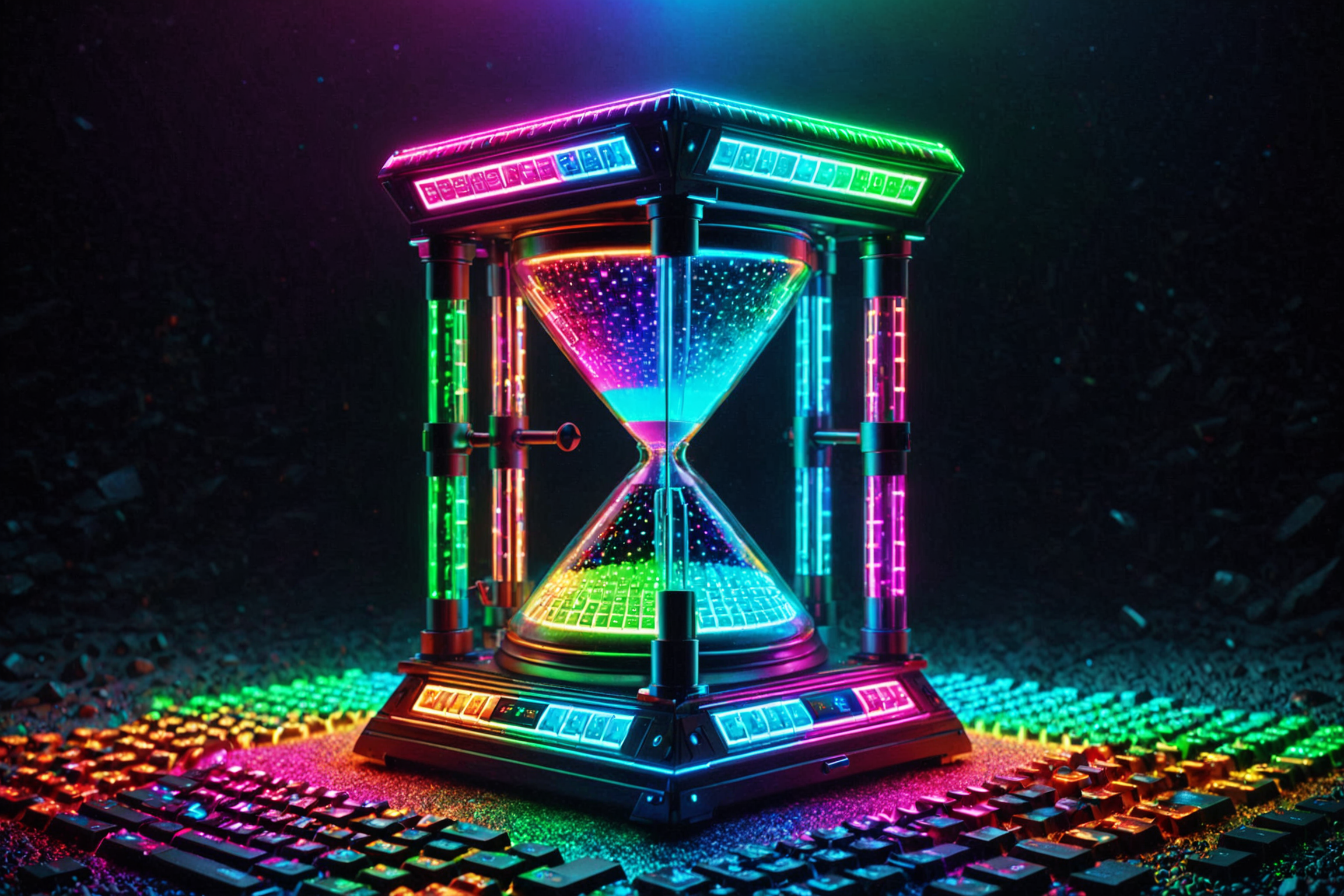 sexy a neon hourglass made out of RGB Keyboards, with glowing sand, digital frame, solo, with multicolor strobe RGB lights, fast and electrifying, an RGB data maze with glowing circuits, neon walls, pulsing energy, detailed background, syncing to a neon rhythm, shimmering with RGB lights, vibrant, radiating RGB lights, dynamic angle, wide shot, a cyber abyssal ritual with artifacts, neon coral, RGB bubbles, a glowing digital pulse with RGB lights, radiating nearby, a digital aurora with RGB lights in waves, cosmic glow, neon dawn with soft RGB lights, shimmering hues, fresh energy, epic, with dramatic RGB lights, best quality, vibrant colors, realistic style, high detail, high-definition, hyper-realistic, extremely high-resolution details, fine texture, incredibly lifelike, realistic, not cartoon, not drawing, highres, 4K resolution, source photo, realistic photo, masterpiece, best quality, amazing quality, very aesthetic, ultra-detailed, detailed textures, natural lighting, soft light, neon RGB colors, vibrant reds, blues, greens, RGB pulse, rhythmic and dynamic, wide shot, <lora:RGB_Keyboard_themed-000008:1>