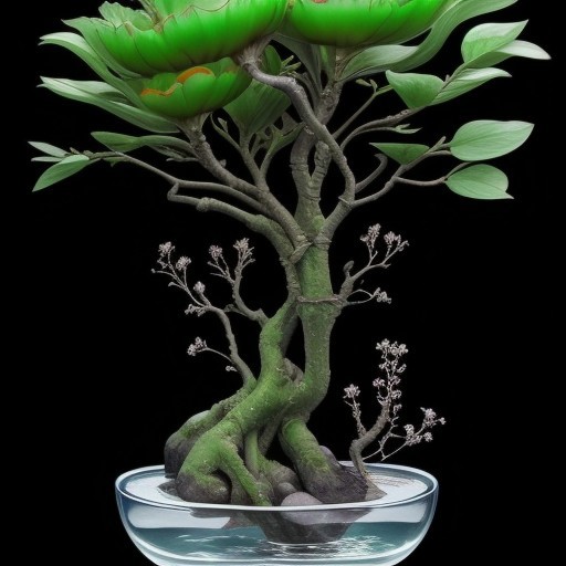 plants niji style, Small tree, fat trunk, bulbous lower trunk, translucent bark, inside trunk filled with water, slim small sharp arcing leaves, green bark, trunk embedded in soil, Organic cavern background,