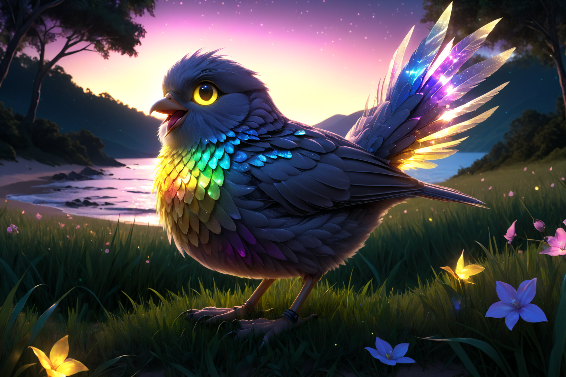 masterpiece, best quality, , a fluffy canary with bright yellow feathers, small beak, round eyes, glowing with h4v_h0l0 effects, solo, with gray fur, sleek and smooth with a faint shimmer, bashful smile, cheeks pink with a soft glow, eyes shy, a spring forest with blooming trees, soft grass, chirping birds with shimmering light, detailed background, licking its paws with a faint shimmer, eyes half-closed, surprised, mouth open with a glowing sparkle, three-quarter view shot, full body visible, a sunset beach play with animals splashing, gentle waves with shimmering light, sunset beach, a sparkling bell with shimmering light, tied around its neck, on a grassy hill, green and sloping with a shimmering glow, sunny, bright sunlight, clear skies, warm glow with a shimmering effect, twilight, soft purple hues, stars emerging, cool air with a subtle shimmer, best quality, vibrant colors, animation 3D style, soft shading, high detail, smooth texture, not realistic, not photorealistic, highres, 4K resolution, masterpiece, best quality, amazing quality, very aesthetic, shimmering light reflections, electric rainbow colors, full spectrum glow, digital shimmer, futuristic and glowing, overhead shot, <lora:Holography:1>