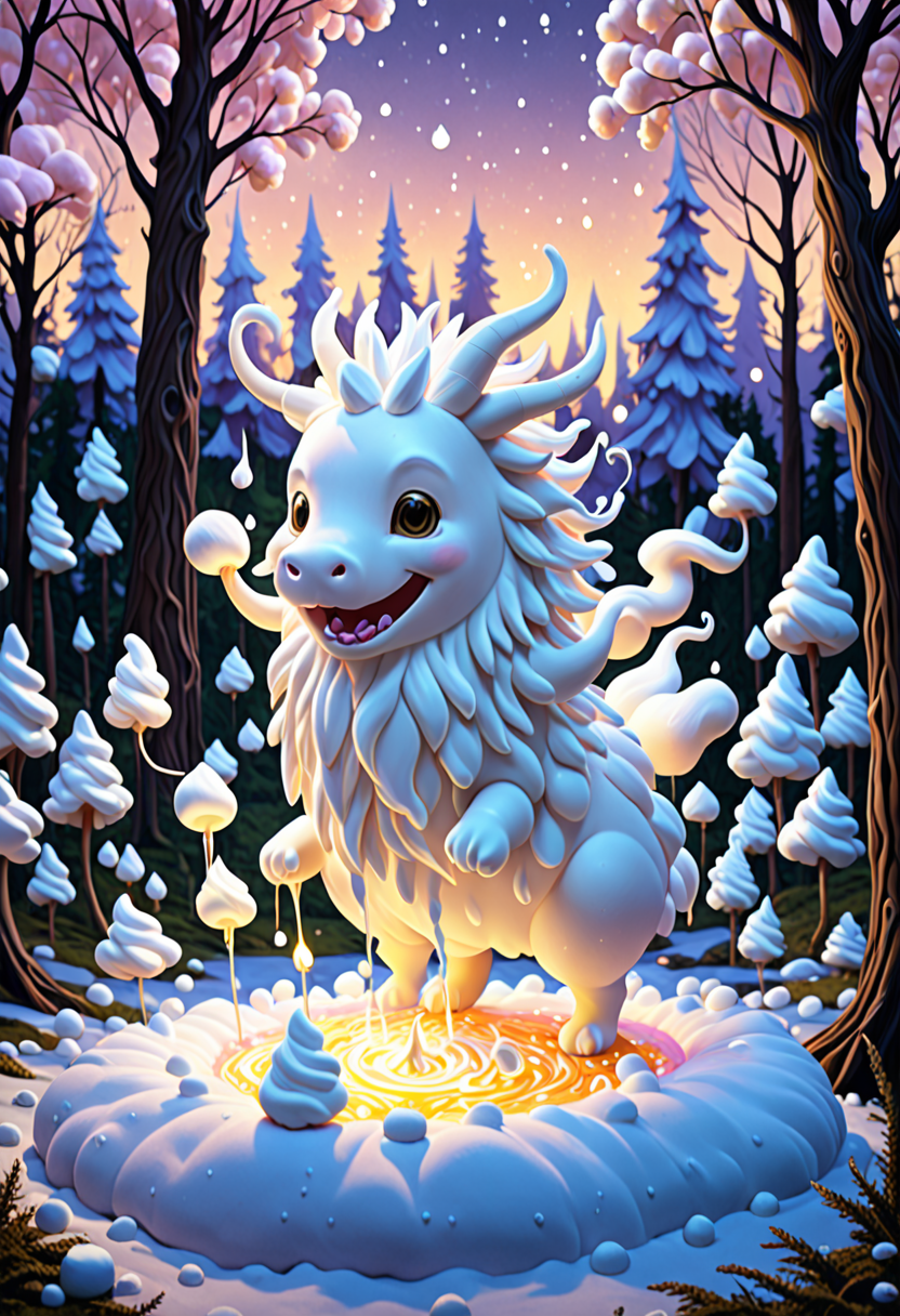 In a world where everything was constructed from fluffy, melted marshmallow, an enigmatic figure, the Marshmallow Alchemist, roamed the landscape, sculpting whimsical landscapes and peculiar creatures using their unique properties. One such creature - a majestic, four-legged beast with a mane of shimmering, golden waves - galloped through this dreamlike realm, its hooves leaving trails of melted marshmallow behind them. The Alchemist's magic had imbued the marshmallow paths with a life of their own, turning them into wiggling, slithering rivers of goo that flowed and pulsed in rhythm with the world around them, creating an ever-shifting tapestry of sweet confections.