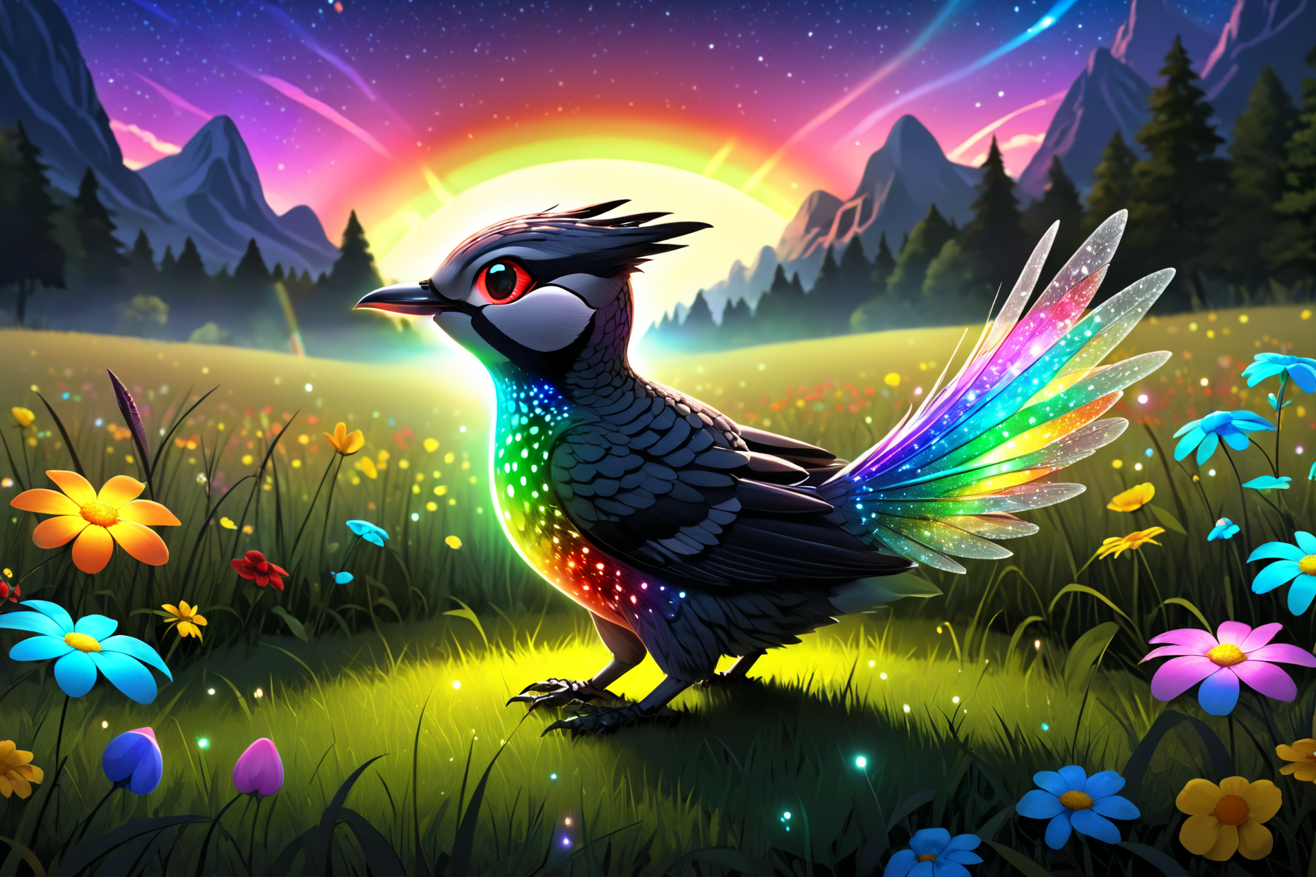 masterpiece, best quality, , a tiny woodpecker with red and black feathers, small beak, curious eyes, glowing with h4v_h0l0 effects, solo, with gray fur, sleek and smooth with a faint shimmer, adorable pout, lips pursed with a soft shimmer, eyes wide, a rainbow meadow with colorful flowers, sparkling stream, rainbow in the sky with shimmering light, detailed background, chasing a firefly with shimmering light, tail wagging, surprised, mouth open with a glowing sparkle, environment focus, wide shot, an animal picnic with animals eating, tiny baskets with shimmering light, sunny meadow, a tiny bracelet with a glowing gem, around its wrist, on gummy ground, sticky and colorful with a glowing sheen, misty, light fog, damp air, soft light with a glowing haze, early evening, soft orange glow, first stars appearing, cooling air with a shimmering glow, best quality, vibrant colors, cartoon style, soft shading, high detail, smooth texture, not realistic, not photorealistic, highres, 4K resolution, masterpiece, best quality, amazing quality, very aesthetic, shimmering light reflections, digital aura colors, glowing greens, cyans, and silvers, neon pulse, rhythmic and dynamic, side profile shot, full body visible, <lora:Holography:1>
