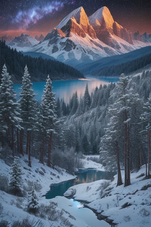 Masterpiece, high-resolution, grainy image, tall mountains, pine forest, lake, snow, galaxy, mountain trail