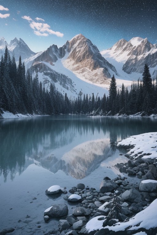 Masterpiece, high-resolution, grainy image, tall mountains, pine forest, lake, snow, galaxy, mountain trail