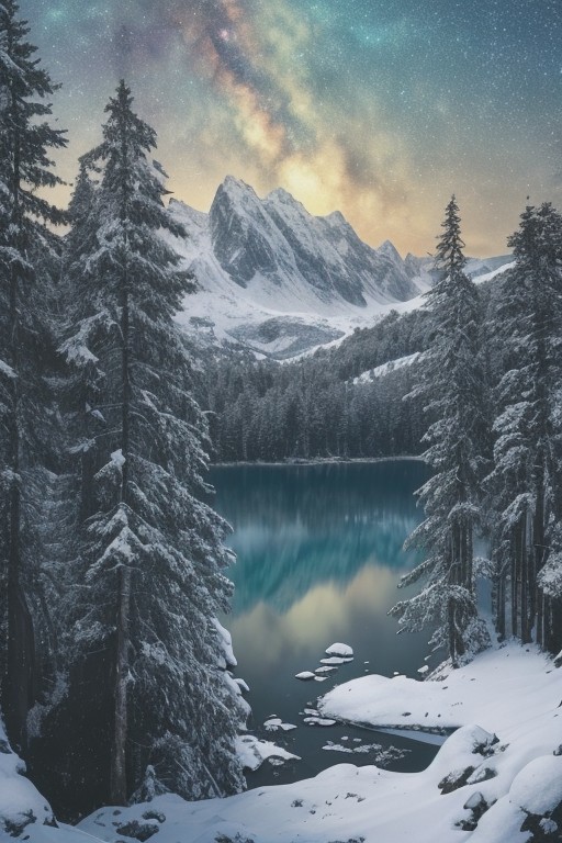 Masterpiece, high-resolution, grainy image, tall mountains, pine forest, lake, snow, galaxy, mountain trail
