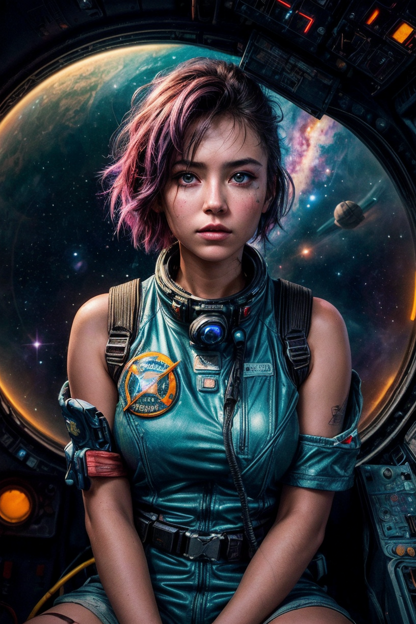 A grungy, rebellious space girl sitting inside a rugged, worn-out spaceship cockpit, messy short hair with colored streaks, grease smudges on her cheeks, wearing a patched-up space suit with wires and tools hanging off, neon glow from control panels lighting her face, scratched metal walls, blinking buttons, graffiti and stickers on the interior, deep space visible through a cracked viewport, distant stars and nebulae outside, bold line art, sketchbook-style shading, vibrant but gritty colors, cartoonish proportions, expressive face, stylized sci-fi art, hand-drawn look, concept art, animated film aesthetic, <lora:add_detail:1.5>, action photo, in space, window, galaxy,((Striking)), ((Astounding)), ((Exquisite)), ((Magnificent)), ((8K)), ((Elegant)), 800mm lens, Super telephoto lens, Distant subjects, Extreme reach, full body photo, floating in space, perfect eyes,