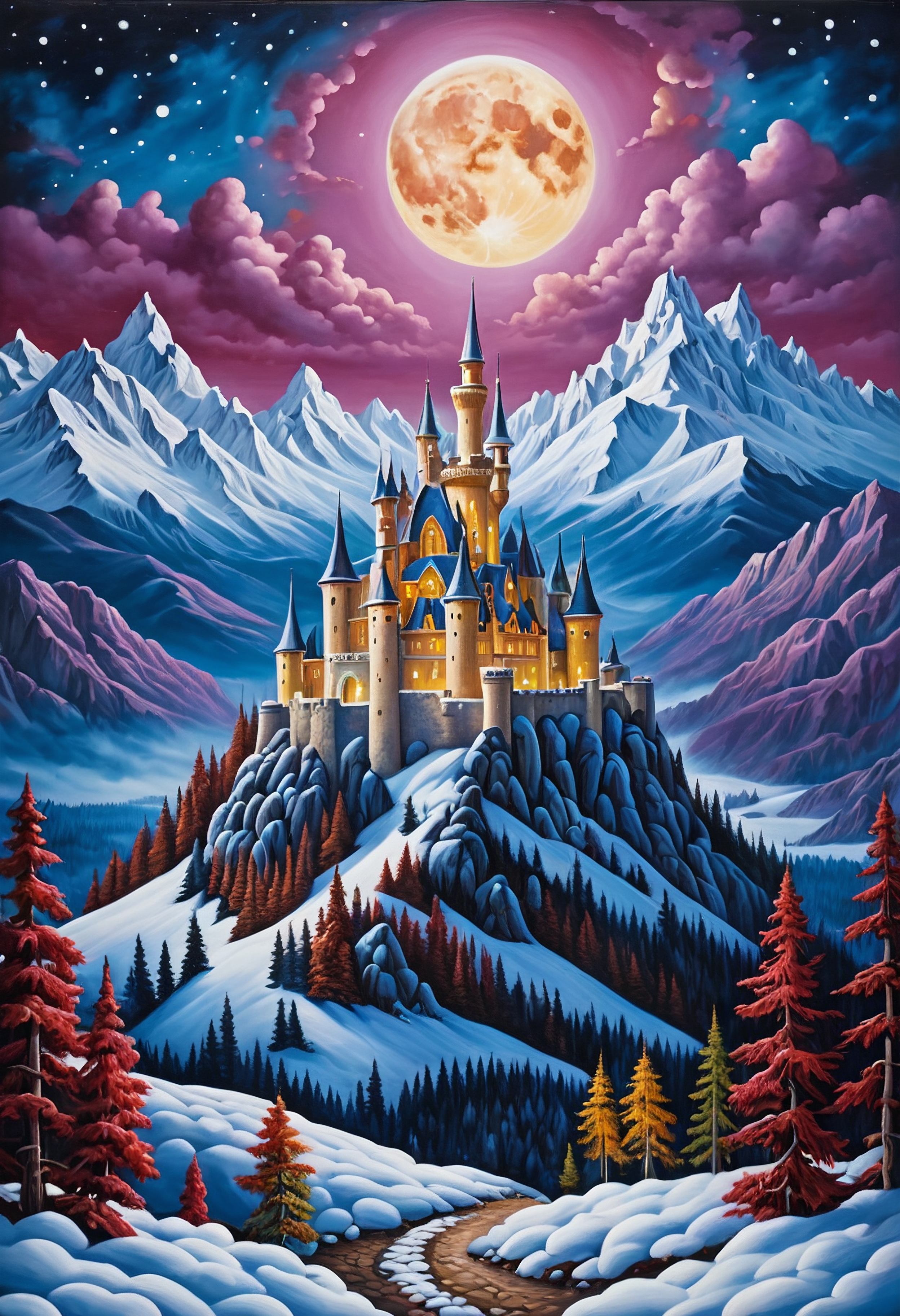 renaissance style oil painting of an epic fantasy landscape made of marshmallow, a magnificent, spired castle, in the snowy marshmallow mountains, in a vibrant night scene, lit by one marshmallow moon, <lora:The_worldmarshmallows:1.5> <lora:add-detail-xl:.7>, lazypos
