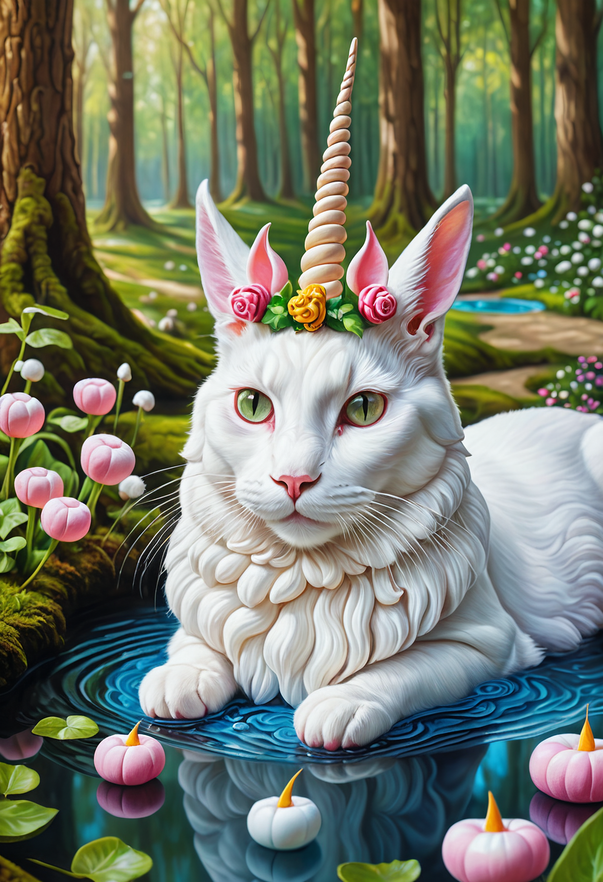 renaissance style oil painting of a caticorn made of marshmallow, cat with a horn on its head, a world of marshmallows, relaxing near a spring pool in the enchanted marshmallow forest, <lora:The_worldmarshmallows:1> <lora:add-detail-xl:.7>, lazypos