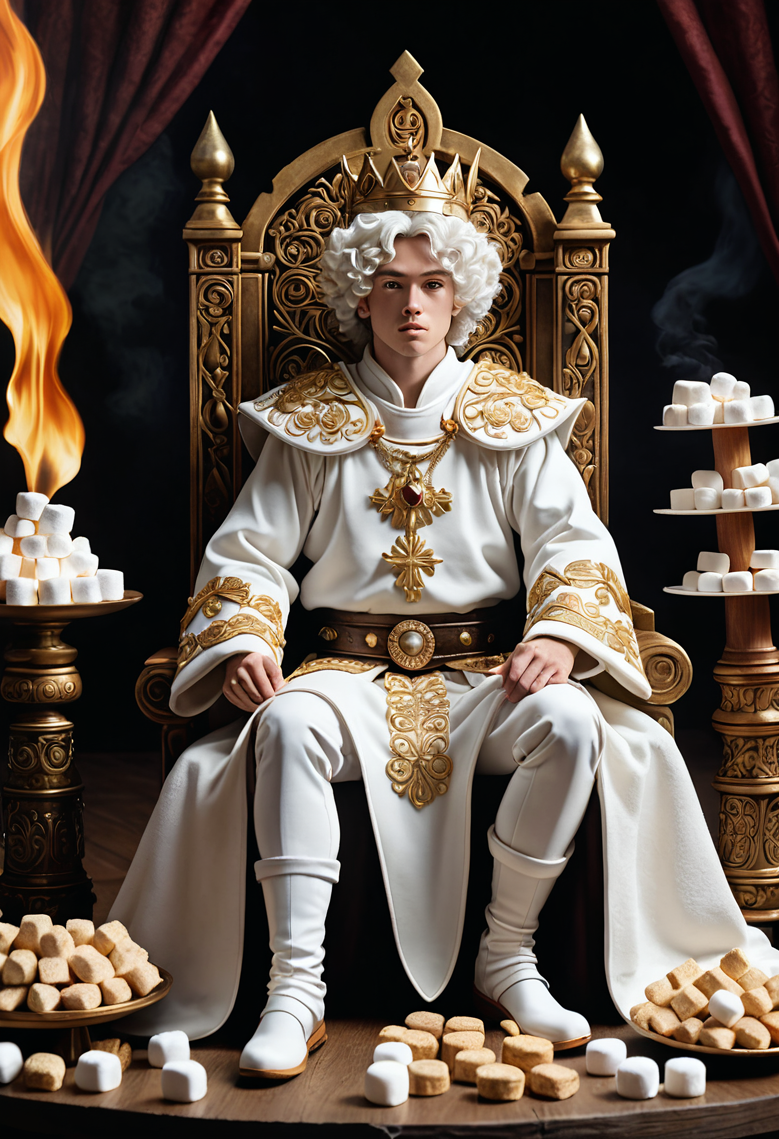artistic cel-shaded, anime inspired scene, watercolor, ink, a world of marshmallows, a whimsical (king made of marshmallows),puffy white marshmallow, hair made of fire, chocolate and graham cracker tunic, armor and robe, sitting on a graham cracker throne, marshmallow ware hammer sitting next to the throne, <lora:The_worldmarshmallows:1> <lora:add-detail-xl:.7>, lazypos