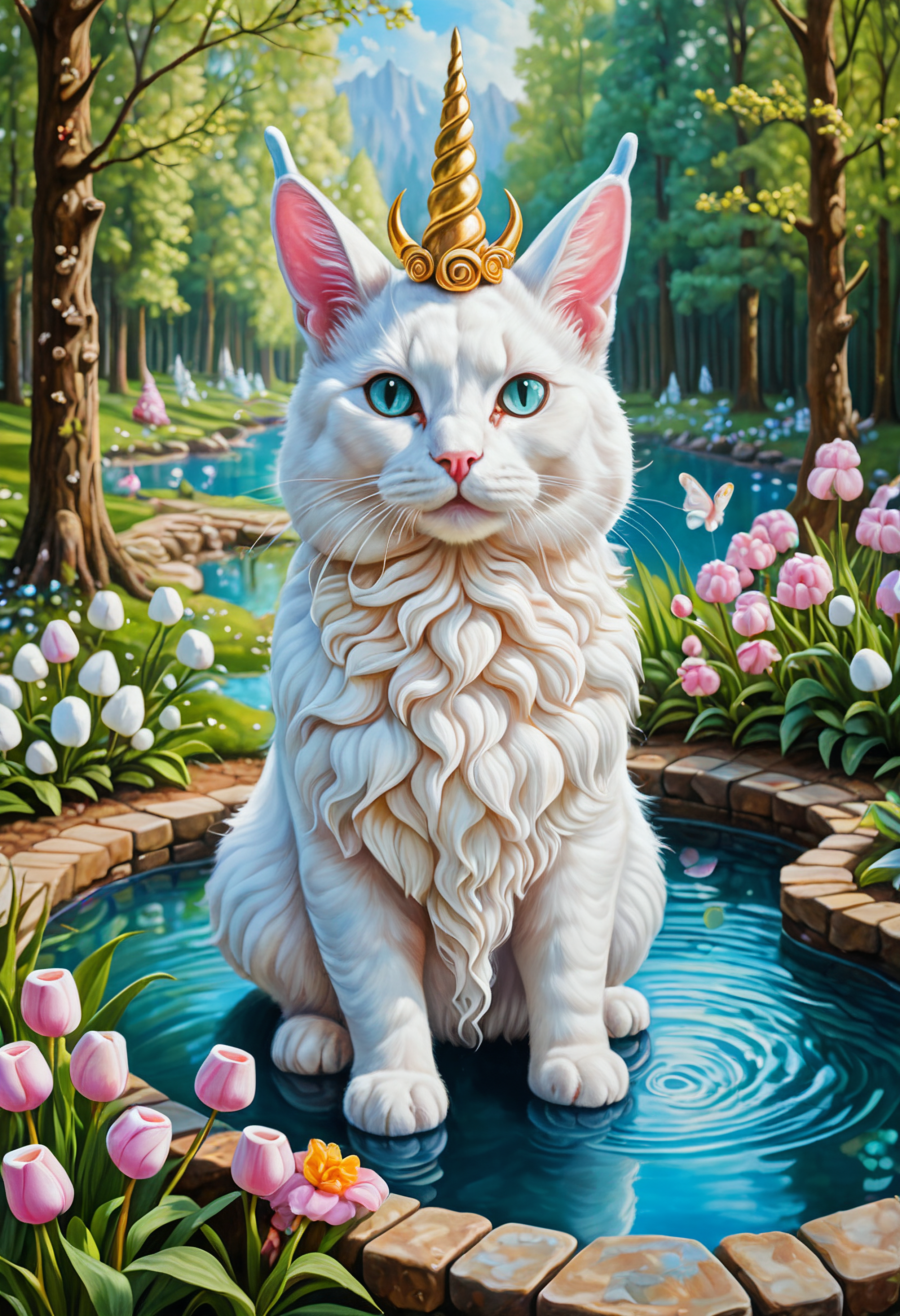 renaissance style oil painting of a caticorn made of marshmallow, cat with a horn on its head, a world of marshmallows, relaxing near a spring pool in the enchanted marshmallow forest, <lora:The_worldmarshmallows:1> <lora:add-detail-xl:.7>, lazypos