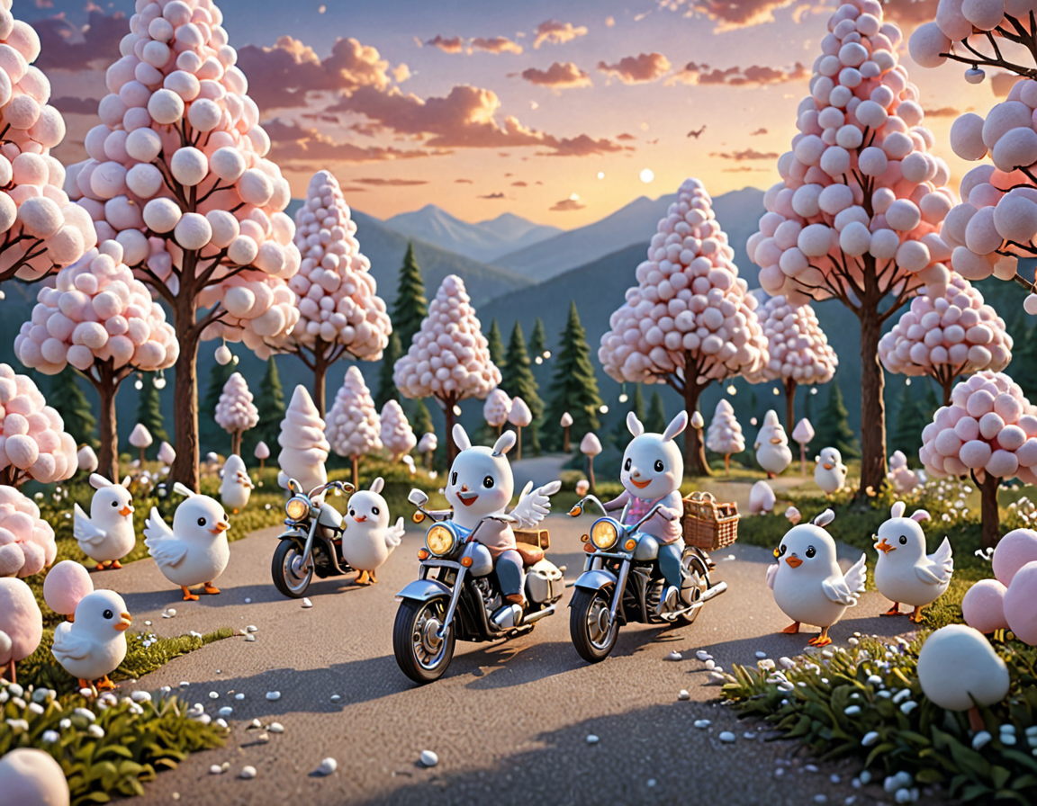 chickens on choppers on an open highway BREAK anime artwork professional 3d model I've created a whimsical digital art scene for you. Imagine a world crafted entirely from fluffy, soft marshmallowss <lora:The_world__marshmallows:1><lora:add-detail-xl:1>