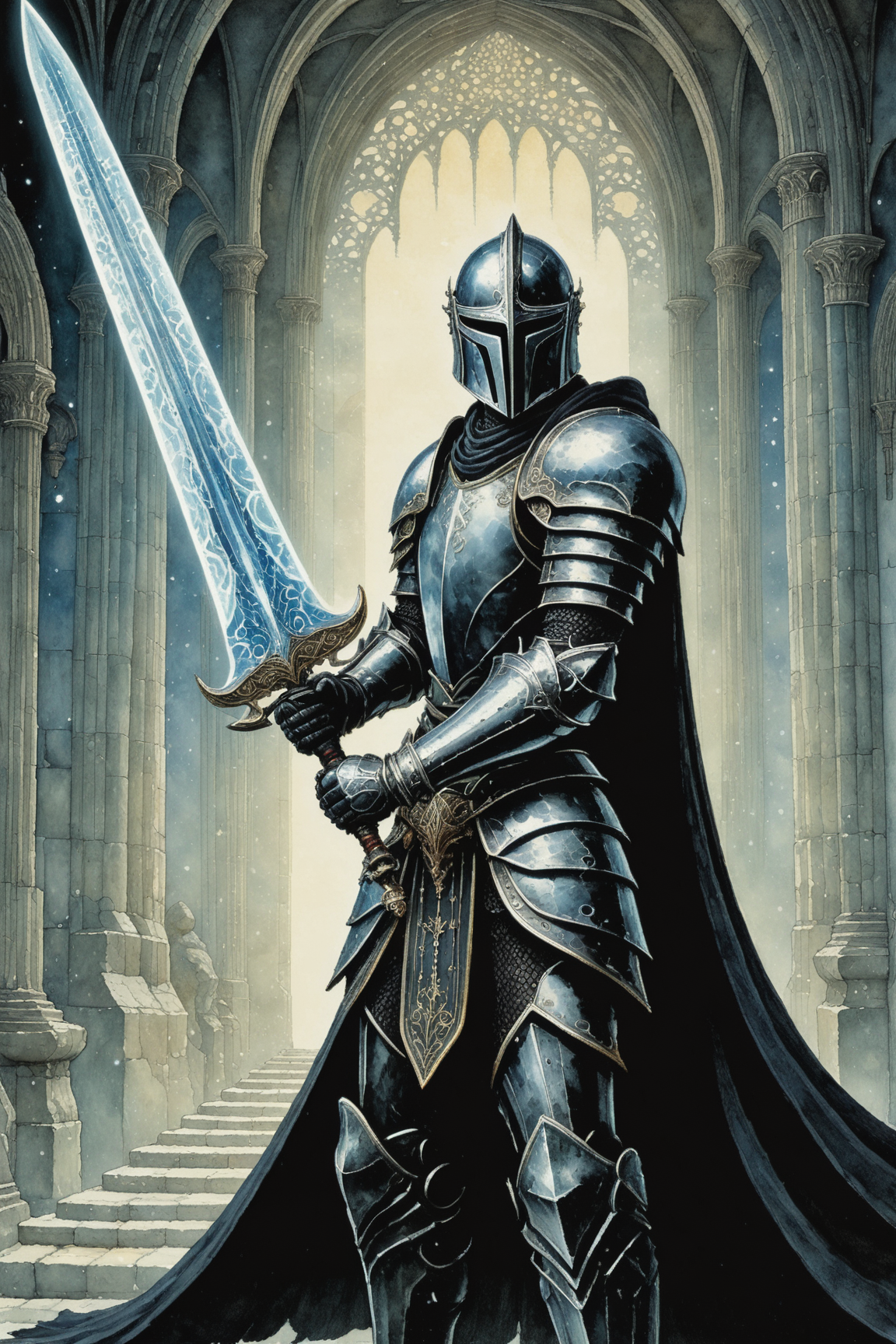 , knight wielding a sword <lora:sword:0.60> ,(by John Bauer and Hugh Ferriss:1.20), (by Ayumi Tanaka and Tara McPherson and Junji Ito0.80), ,, <lora:EnvyAnimeWatercolorXL02:0.60>
