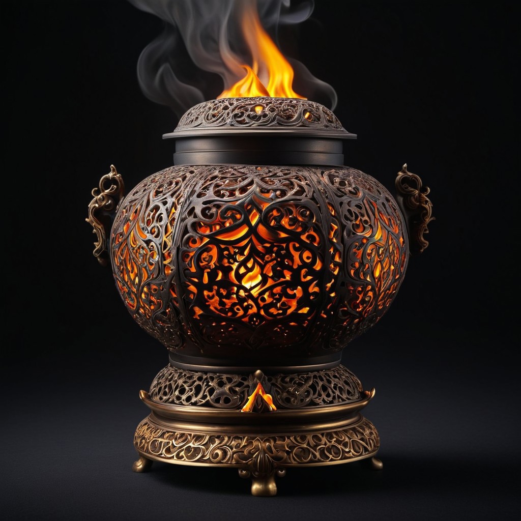 8k, score_9, score_8_up, score_7_up, masterpiece,realistic,ultra detailed, vibrant colors,photo-realistic, A huge incense burner made of iron, shaped like a jar, with intricate carvings and arabesque patterns, and a fire burning inside.
