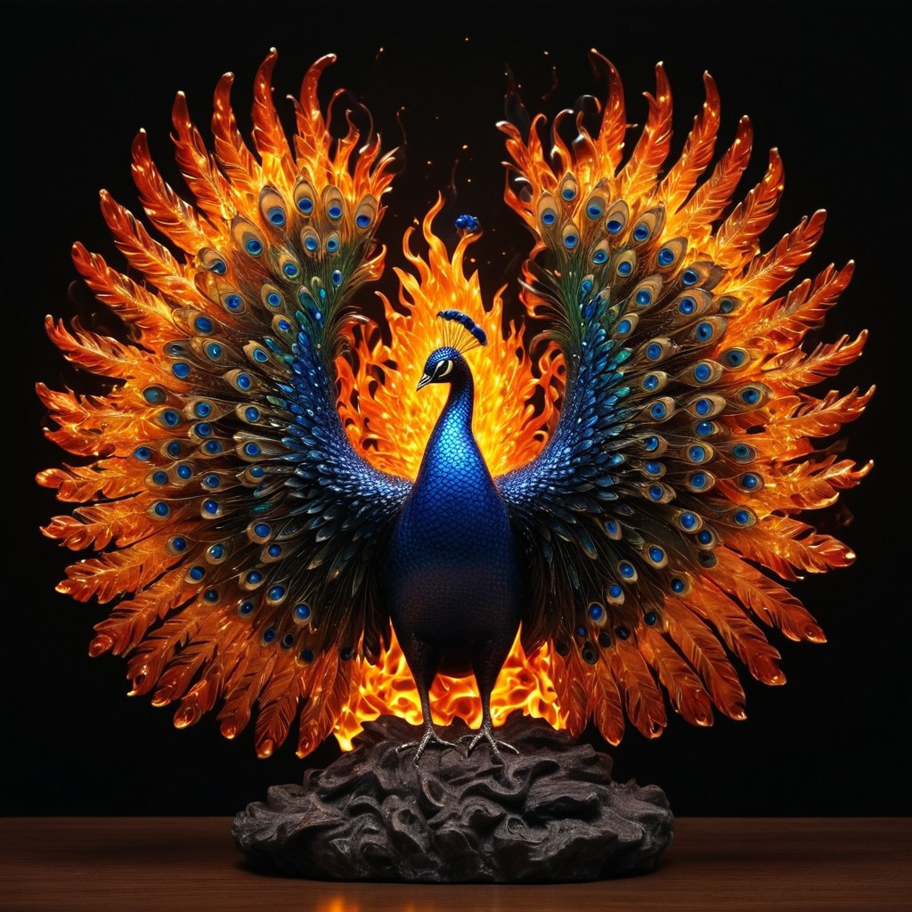 8k, score_9, score_8_up, score_7_up, masterpiece,realistic,ultra detailed, vibrant colors,photo-realistic, Peacock sculpture in flames, spreading wings made of glass, intricate patterns, oriental art
