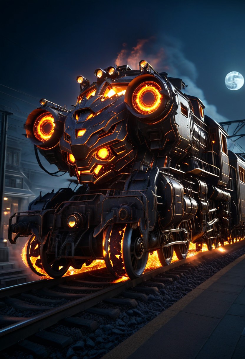 HavvoricFireDarkstyle, closeup Burning mecha train, wear round goggles, in town, night, moon, cinematic, cinematic lighting, (masterpiece, best quality:1.4), ultra-high res, 4k, insanely detailed, sfw,