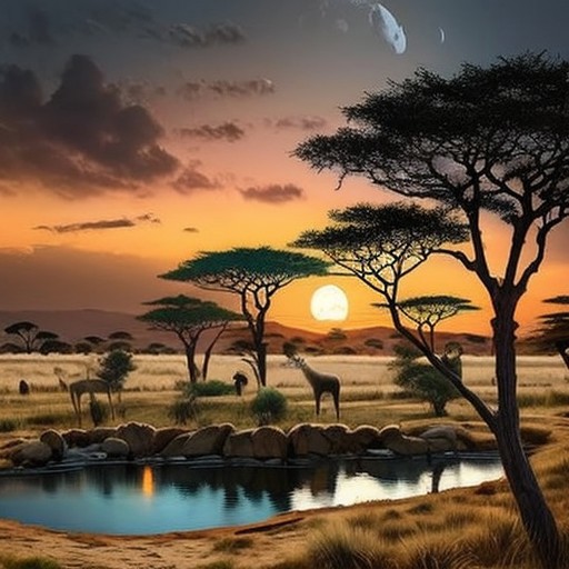 RAW photo, (masterpiece:1.3), subsurface scattering, heavy shadow, (high quality:1.4), (intricate, high detail:1.2), professional photography, HDR, High Dynamic Range, realistic, ultra realistic, photorealistic, high resolution, film photography, ambient lighting, atmospheric effects, <lora:detail_slider_v4:2>, OverallDetail, <lora:Savanna:1>, bare tree, cloud, cloudy sky, day, deer, evening, field, flock, full moon, gradient sky, grass, hill, landscape, mountain, no humans, orange sky, outdoors, painting \(medium\), palm tree, pond, savanna, scenery, shore, sky, traditional media, tree, water