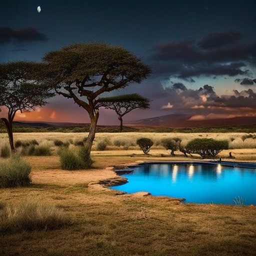 RAW photo, (masterpiece:1.3), subsurface scattering, heavy shadow, (high quality:1.4), (intricate, high detail:1.2), professional photography, HDR, High Dynamic Range, realistic, ultra realistic, photorealistic, high resolution, film photography, ambient lighting, atmospheric effects, <lora:detail_slider_v4:2>, OverallDetail, <lora:Savanna:1>, bare tree, cloud, cloudy sky, day, deer, evening, field, flock, full moon, gradient sky, grass, hill, landscape, mountain, no humans, orange sky, outdoors, painting \(medium\), palm tree, pond, savanna, scenery, shore, sky, traditional media, tree, water