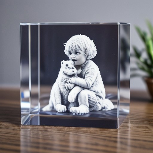 An ultra-realistic 3D laser-engraved crystal cube, crafted with high-precision ultrasonic technology. Perfectly centered inside the highly transparent, flawless cube is an exquisitely detailed engraving of a young boy gently sitting beside his loyal dog — both captured with perfect proportions, natural expressions, and lifelike posture. The engraving shows intricate textures: the soft strands of the boy’s hair, the detailed fur of the dog, and the emotional warmth between them, as if frozen in a moment of love and companionship. Beneath this delicate scene, the name "Fredy" is finely etched in elegant cursive lettering, appearing seamlessly integrated into the base of the crystal — slightly glowing with soft internal reflections. The crystal cube, almost invisible at the edges due to its high-grade optical clarity, plays masterfully with cinematic lighting. Internal refractions, soft glows, and subtle rainbow-like holographic effects interact with its surfaces, enhancing the illusion of depth and dimension. Set within a cozy, warmly lit living room, the background features a tastefully framed scenic landscape painting hanging on the wall. Below it, a classic black-and-white soccer ball rests on a wooden shelf, softly illuminated by ambient light. The entire room is bathed in gentle, diffused lighting that emphasizes the brilliance, transparency, and photorealism of the crystal cube and its emotional centerpiece.