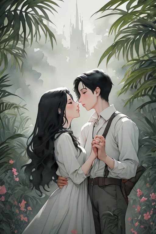 1couple, 1man and 1 woman, lovers, forever, very beautiful, lovely, ((high_quality, distinct_image)), masterpiece, high quality resolution, mature, fantasy, in the garden, peace, digital painting, jungle, extremely_detailed_CG, lovely, illustration, 20years old, (beautiful:1.5), Dreamlike, beautiful_detailed_hair, watercolor, beautiful, best quality, blurly, colorful, pastel tone,
