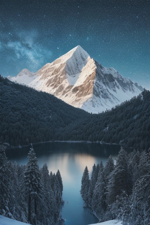 Masterpiece, high-resolution, grainy image, tall mountains, pine forest, lake, snow, galaxy, mountain trail