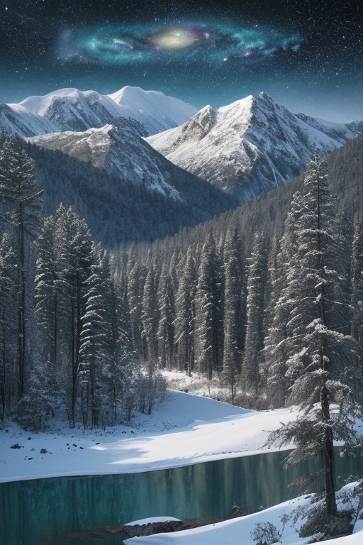 Masterpiece, high-resolution, grainy image, tall mountains, pine forest, lake, snow, galaxy, mountain trail