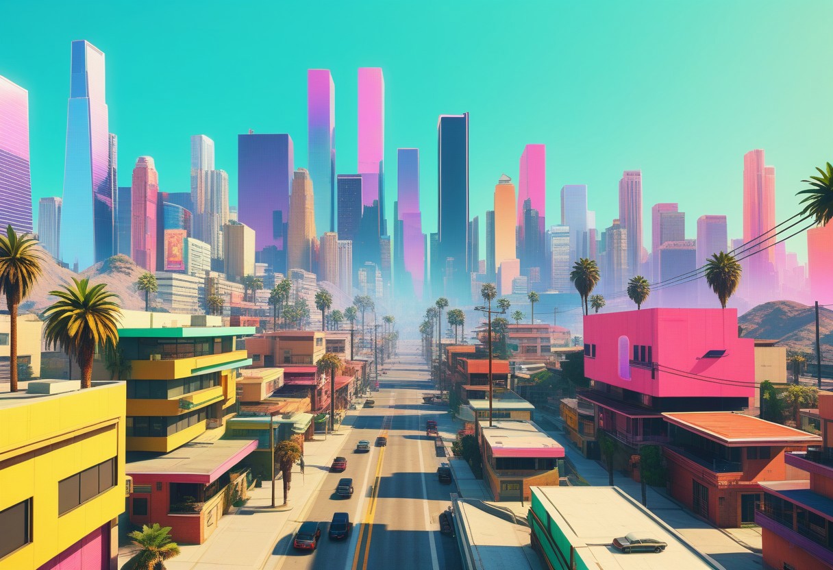 neo-photo, Create The City Of Los Santos using innovative mixed media style digital art combining 3D, glitch art, and photography. Feature futuristic cityscapes with unexpected textures, layers, and dimensions., sharp focus, very defined, refined, follow negative prompts